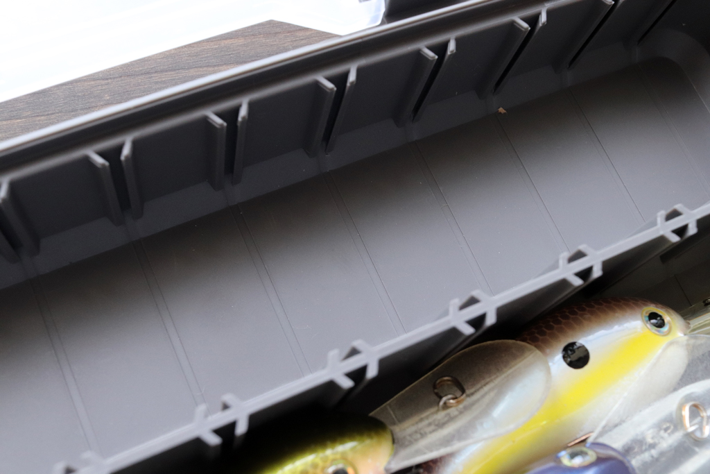 仕切り板を入れるレールの底面にも溝が入っており・・・、ルアーの針が引っ掛かかりにくい仕組みになっています。